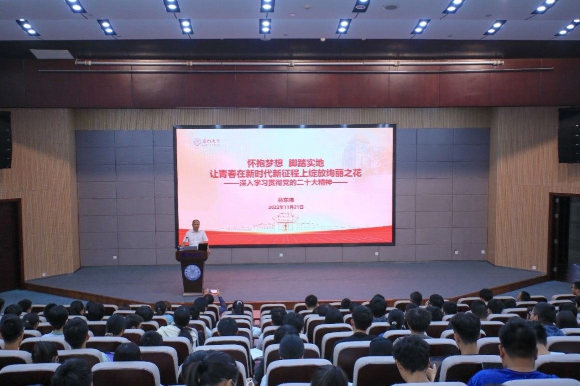 11月21日下午,校党委常务副书记林东伟在翔安校区德旺图书馆报告厅为2022级计算类本科生讲授了题为“怀抱梦想 脚踏实地 让青春在新时代新征程上绽放绚丽之花——深入学习贯彻党的二十大精神”的思政课。