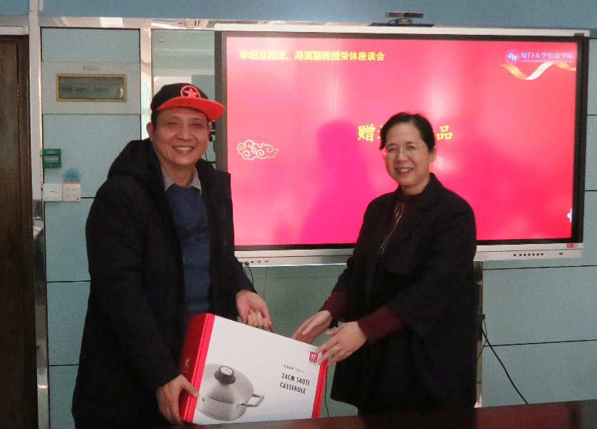 史晓东分别介绍李绍滋和冯寅的学术生涯,以及在厦门大学工作期间所取得的成绩和贡献。李承华代表学校向两位老师颁发感谢信和金质校徽,以感谢两位老师为厦门大学做出的贡献。龙坚毅代表信息学院向两位老师赠送纪念品,感谢二位老师为信息学院学科建设的辛勤付出。江敏代表智能系向两位老师献花。数十位未能来到现场的毕业生也以视频的方式回顾了在厦门大学求学经历,表达对两位老师辛勤培养的感激之情,并对老师表达深深的祝福。