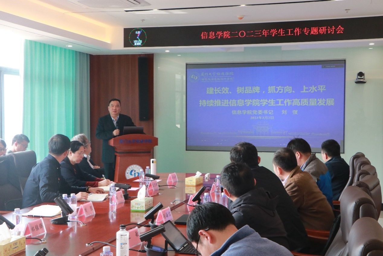 为进一步提高政治站位,凝聚共识、狠抓落实,全面推进“三全育人”工作提质增效,切实推动学院学生工作高质量发展,3月2日上午,信息学院召开学生工作专题研讨会,学院领导、系(所)负责同志、党政管理人员齐聚一堂,系统总结近年来学院学生工作成效,结合学校、学院新学期工作布置会部署要求,明确当前和今后一段时期信息学院学生工作目标任务,提出加强和改进学生工作的新思路新举措,就狠抓工作落实进行再动员。校学生处副处长、翔安校区学生办主任高斌出席。院党委书记刘弢讲话。