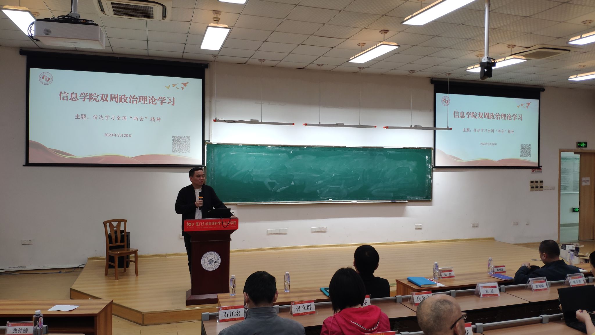 3月20日,信息学院召开传达学习2023年全国两会精神大会,传达学习习近平总书记在全国两会上的重要讲话精神和全国两会精神。全国人大代表、经济学院教授潘越,全国政协委员、信息学院教授廖明宏先后传达全国两会精神。院党委书记刘弢主持会议。