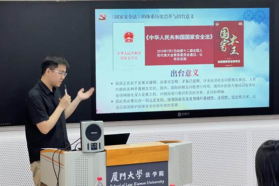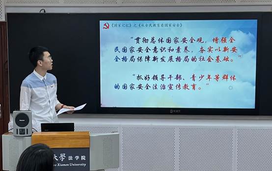 “廌”在四方先锋党支部委员林晏泽以“国家安全,为了你,依靠你”为主题,分享身边的“国家安全”,引用党的二十大报告中重要论述,强调“国家安全是民族复兴的根基,社会稳定是国家强盛的前提。必须坚定不移贯彻总体国家安全观,把维护国家安全贯穿党和国家工作各方面全过程,确保国家安全和社会稳定。”林晏泽通过《国家记忆》之《从全民教育看国家安全》短片中的案例,让大家对国家安全有了更加直观的认识。