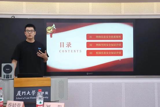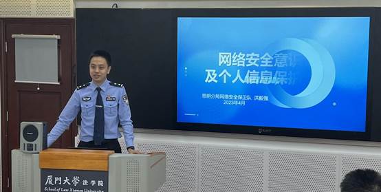 思明分局网络安全保卫队副队长洪毅强警官对《国家安全法》做了详细的介绍和补充,向大家介绍了网络空间安全具体案例和相关统计数据。他指出,当下网络安全和个人信息保护形势严峻,公民个人信息安全面临不小的挑战,以“摄像头”违法拍摄和搜集个人隐私为代表的信息泄露事件层出不穷,个人应时刻警惕信息安全风险,守护好自己的隐私安全。他提到,我们应该谨防受到境外势力的渗透,成为他们从事间谍活动的工具人,他还提醒,在军事区域勿要私自拍摄,以免泄露国家军事机密。最后他借用习近平在2018年召开的中央网络安全和信息化工作会议上强调的“没有网络安全,就没有国家安全”,告诫与会同志们要时刻注重保护个人信息安全,紧绷网络安全和信息安全的那根“弦”。