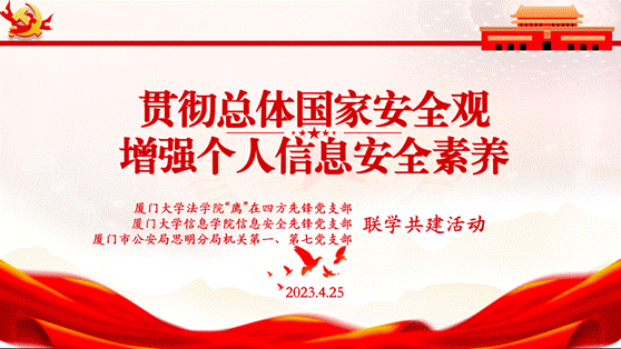 为了深入学习贯彻党的二十大精神,响应全民国家安全日的号召,425日上午,信息学院信息安全先锋党支部、法学院“廌”在四方先锋党支部和厦门市公安局思明分局机关第一、第七党支部,在思明校区法学院C420会议室举行主题为“贯彻总体国家安全观 增强个人信息安全素养”的联学共建活动。本次活动由“廌”在四方先锋党支部书记黄许主持,厦门市公安思明分局政治处二级警长潘岩、三级警长李慧慧、网络安全保卫队副队长洪毅强,厦门大学法学院团委书记刘茜,厦门大学信息学院团委副书记蔡婧蓉、辅导员刘心和出席活动。