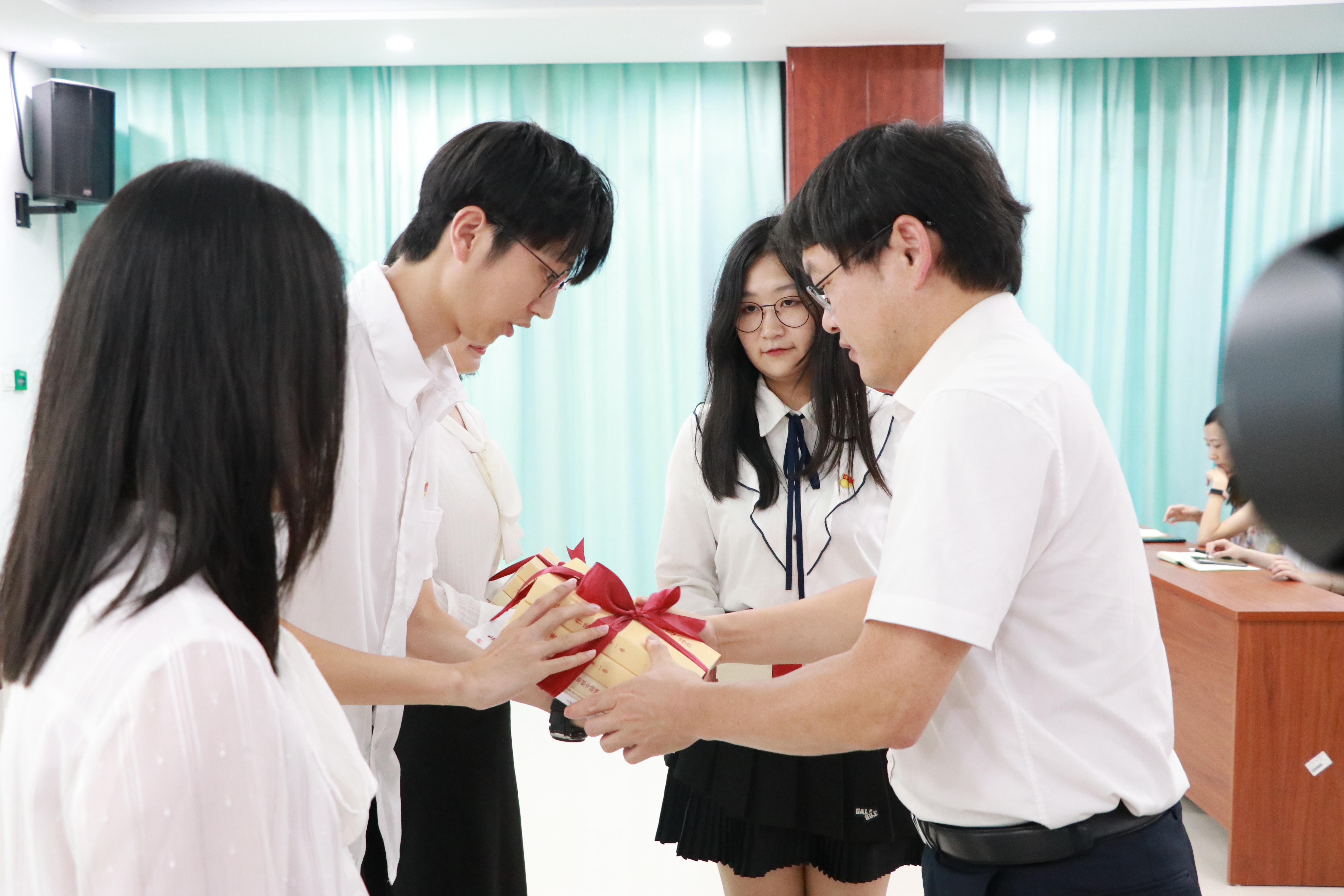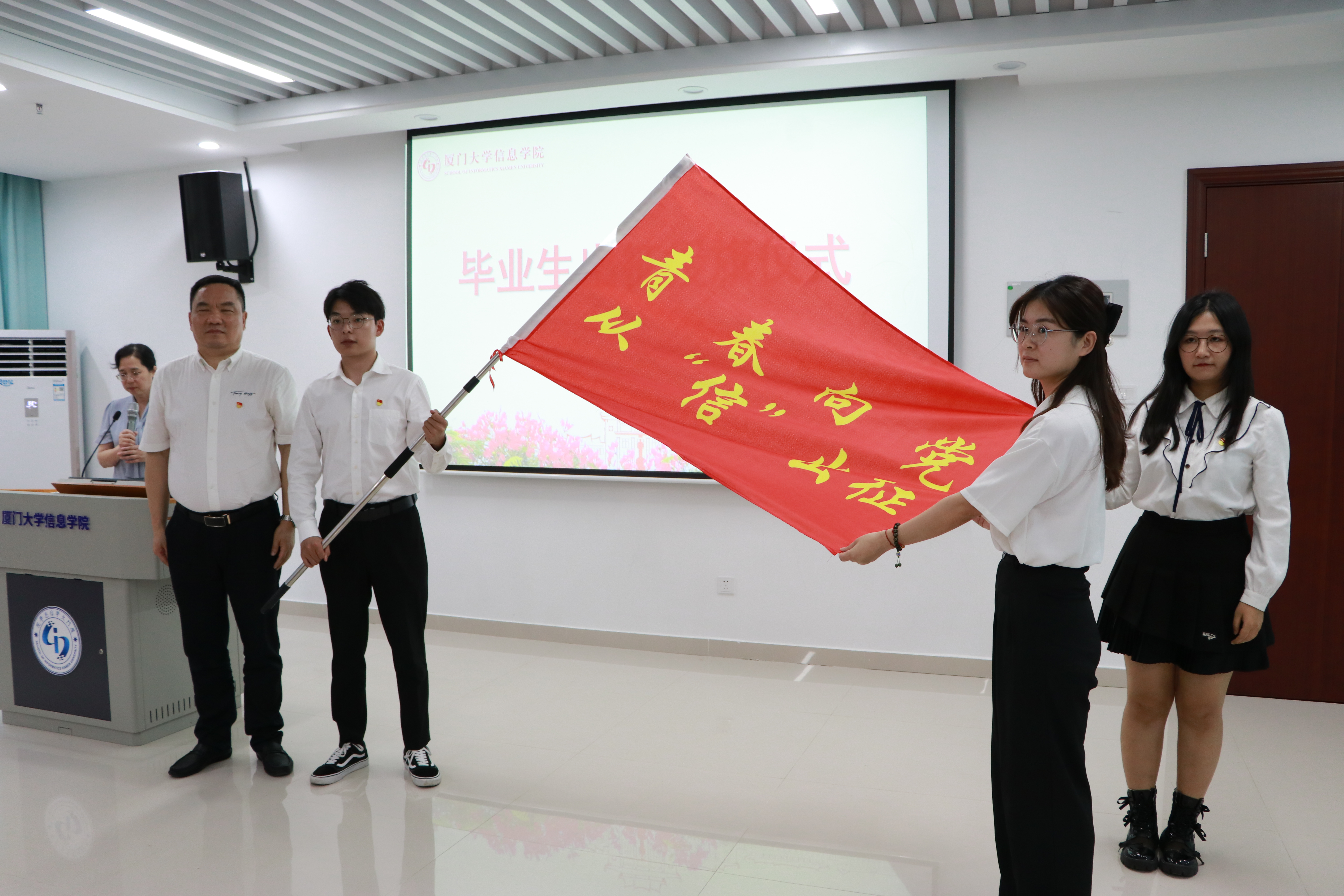 会上举行了赠书、赠旗仪式。院党委副书记郑镇锋向毕业生代表赠送《习近平著作选读》(第一、第二卷)《习近平新时代中国特色社会主义思想专题摘编》《厦门大学信息学院院史》等书籍。低年级学生代表从毕业生代表手中接过“厦信青年”旗帜,毕业生代表从刘弢手中接过“青春向党,从‘信’出征”旗帜。挥舞的旗帜,表达着信息学子牢记初心使命,凝聚青春力量,对标一流,矢志奋斗,在新时代新天地中施展抱负、建功立业的坚定决心。