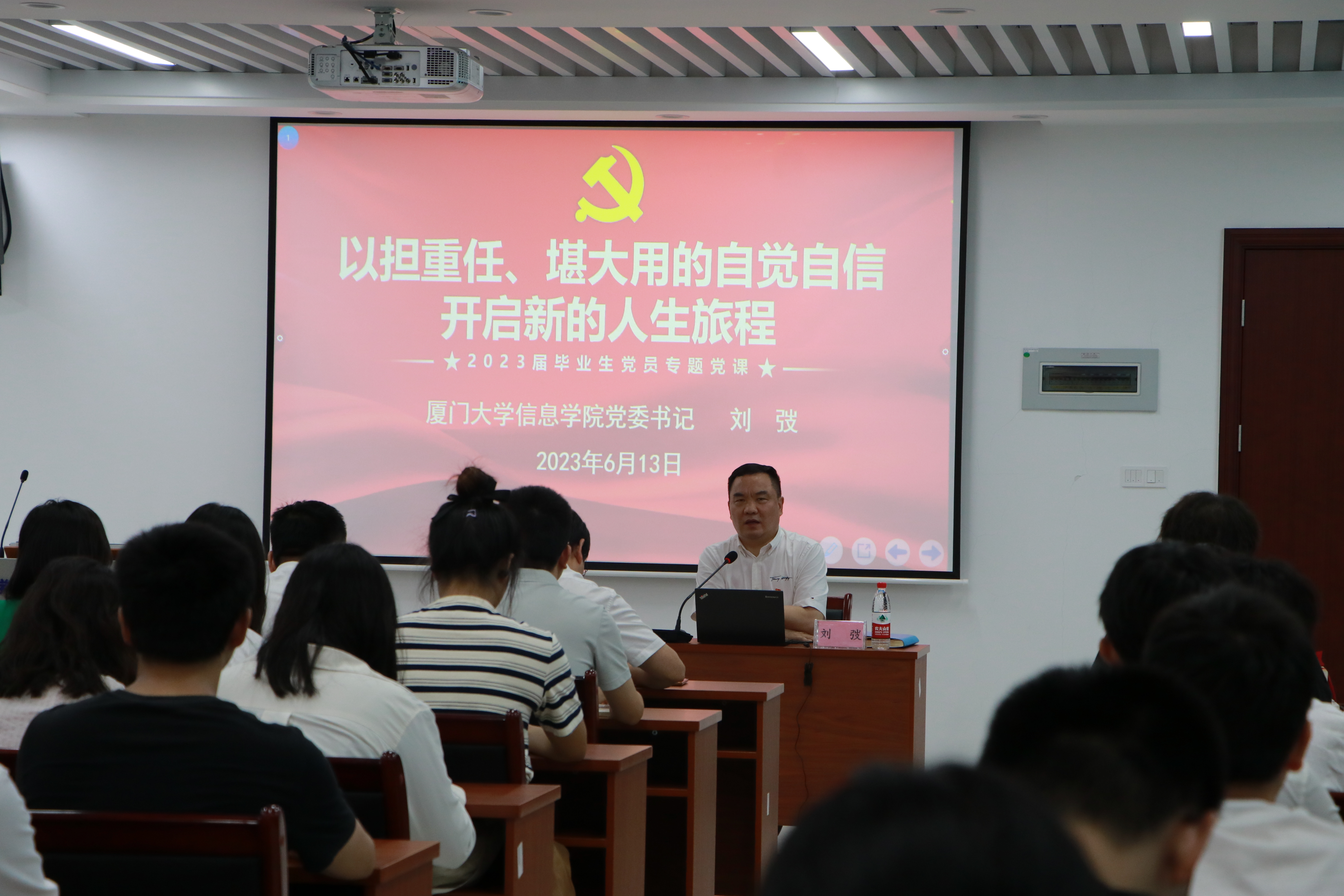 青春向党,从“信”出征。6月13日下午,信息学院在翔安校区正信楼举行2023届毕业生党员教育大会暨毕业生出征仪式。院党委书记刘弢作《以担重任、堪大用的自觉自信开启新的人生旅程》专题报告,为毕业生上了一堂学习贯彻习近平新时代中国特色社会主义思想主题教育党课,向毕业生提出希望和要求。院领导向毕业生代表授旗、赠书,送上学院对毕业生深切的勉励与真诚的祝福。院党委副书记龙坚毅主持会议。