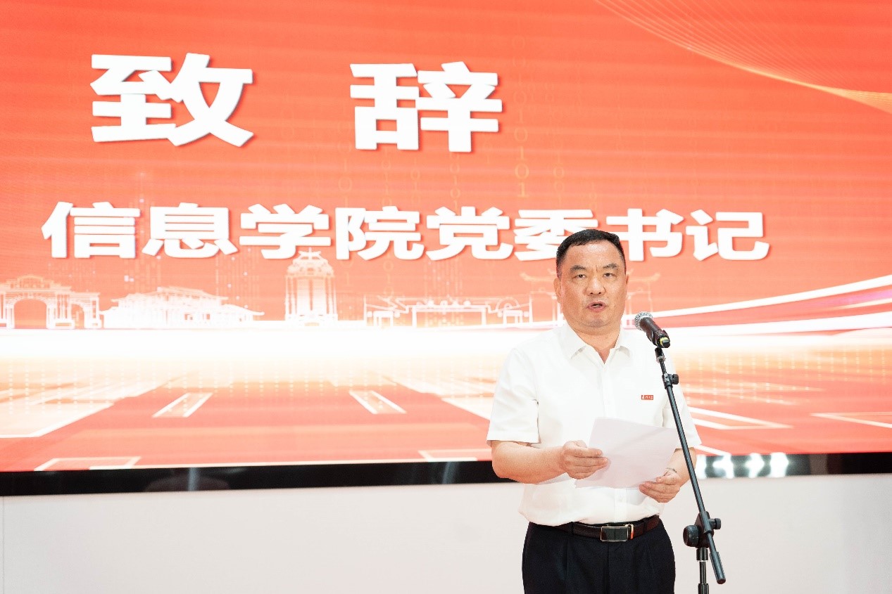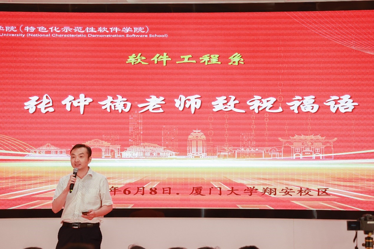 党委书记刘弢代表信息学院致辞,他回顾信息学院四年来的发展历程,总结办学经验与办学成果,表达学院对大家的深情嘱托与期望。他指出,学院坚持以立德树人为根本任务,以为党育人、为国育才为根本目标,以服务中华民族伟大复兴为教学使命,汇聚教学资源、科研资源、企业行业政府资源、校友资源、服务学生成长成才。他深情谈到,一朝厦大人,终身厦大情,同学们始终是母校母院是老师们心中最深情的牵挂。寄语同学们以能担重担、可堪大用的自觉与自信,不负时代,不负韶华,以青春奋进之笔,书写属于自己的人生华章。