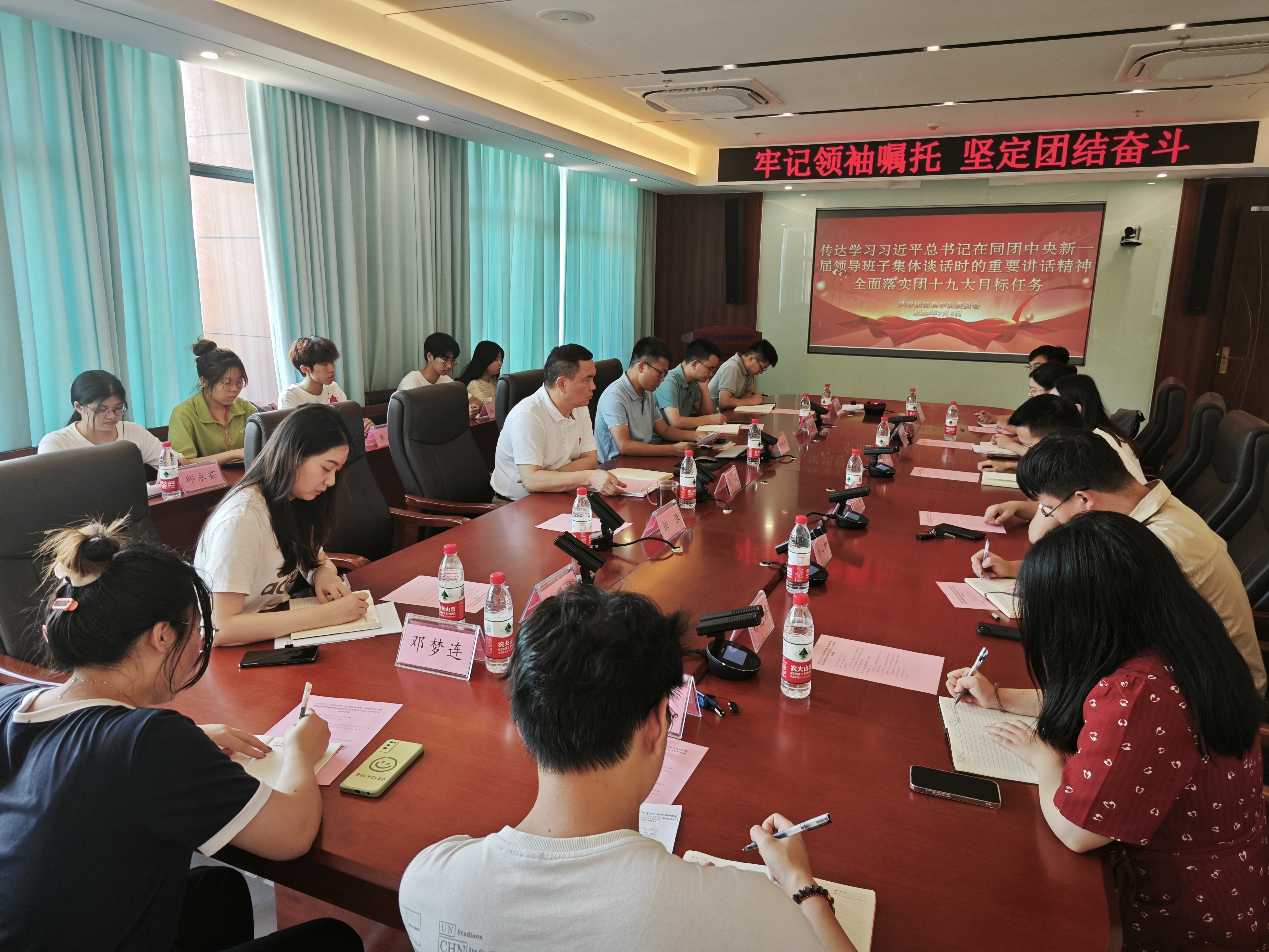 与会人员首先观看央视新闻联播视频,研读新华社通稿,深入学习习近平总书记在同团中央新一届领导班子集体谈话时的重要讲话精神,并交流学习心得体会。