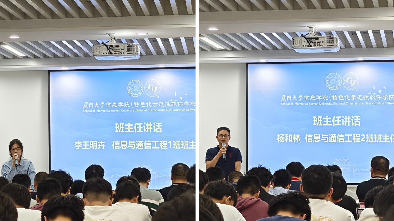 通信工程系2022级本科生班主任李王明卉和杨和林结合自身成长经历,为同学们提出了班风学风建设的要求,送上专业学习的建议。李王明卉说,同学们一定要注重课上听讲,善于总结,学会设立短中期的学习目标,充分利用学校优质的学术资源与平台,积极与学长学姐和老师们沟通交流,积极参与学科专业竞赛锻炼自我。针对存在旷课、挂科等现象的同学,杨和林表示,任何时间的改变都不晚,希望大家一步一步积极行动起来,由量变实现质变。