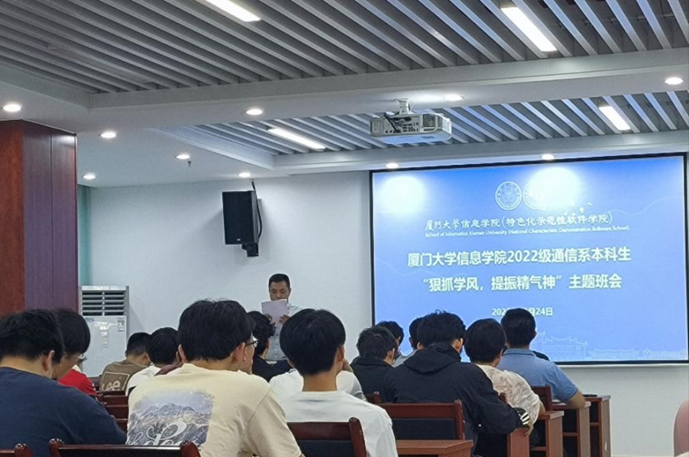 为推动本科生学风建设,进一步提振学生学科自信,激发学生学习热情,10月24日中午,信息学院在翔安校区正信楼108会议室举办信息与通信工程系2022级本科生“狠抓学风,提振精气神”主题班会。信息学院党委书记刘弢出席并讲话。党委副书记郑镇锋,副院长廖明宏、袁飞,信息与通信工程系主任孙海信、副主任黄悦出席。信息与通信工程系副主任杨琦主持班会。