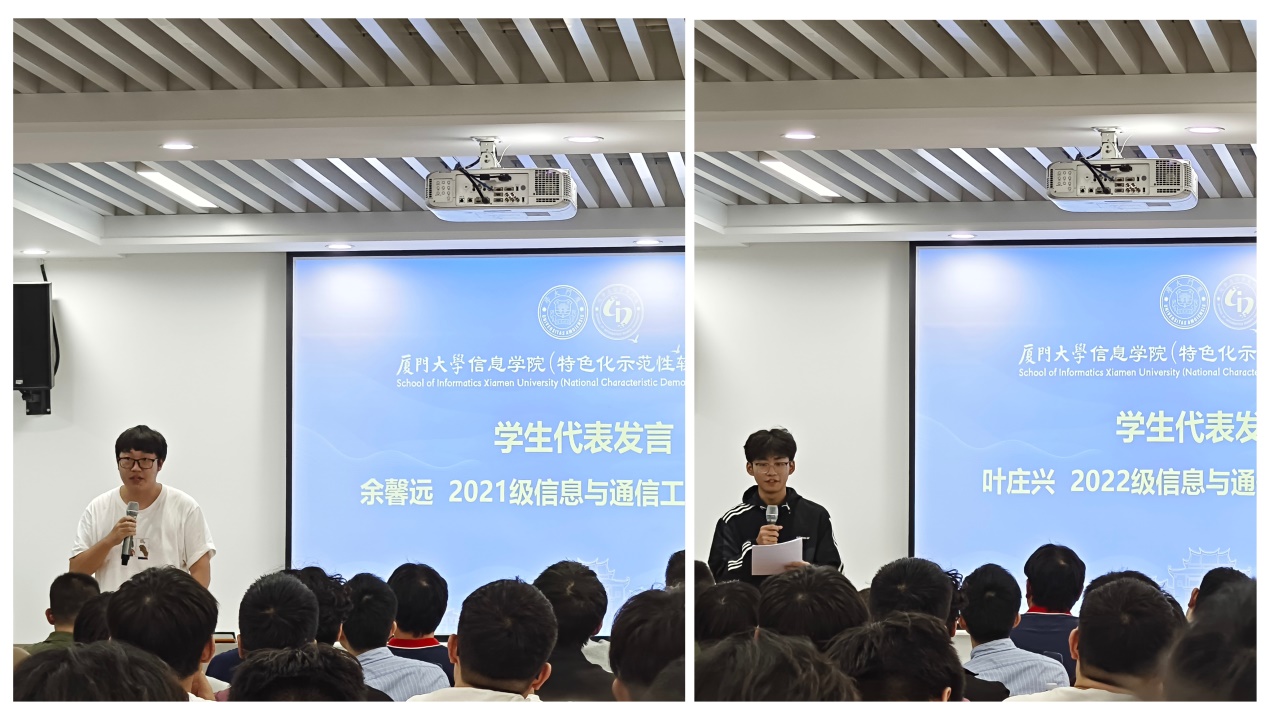信息与通信工程系2021级本科生余馨远和2022级本科生叶庄兴作为学生代表分享学习经验。余馨远同学分享了自己“赶超”的经历,鼓励同学不放弃希望,以坚持创造奇迹。叶庄兴分享了有效平衡学习与学生工作,获得“双赢”的经验。