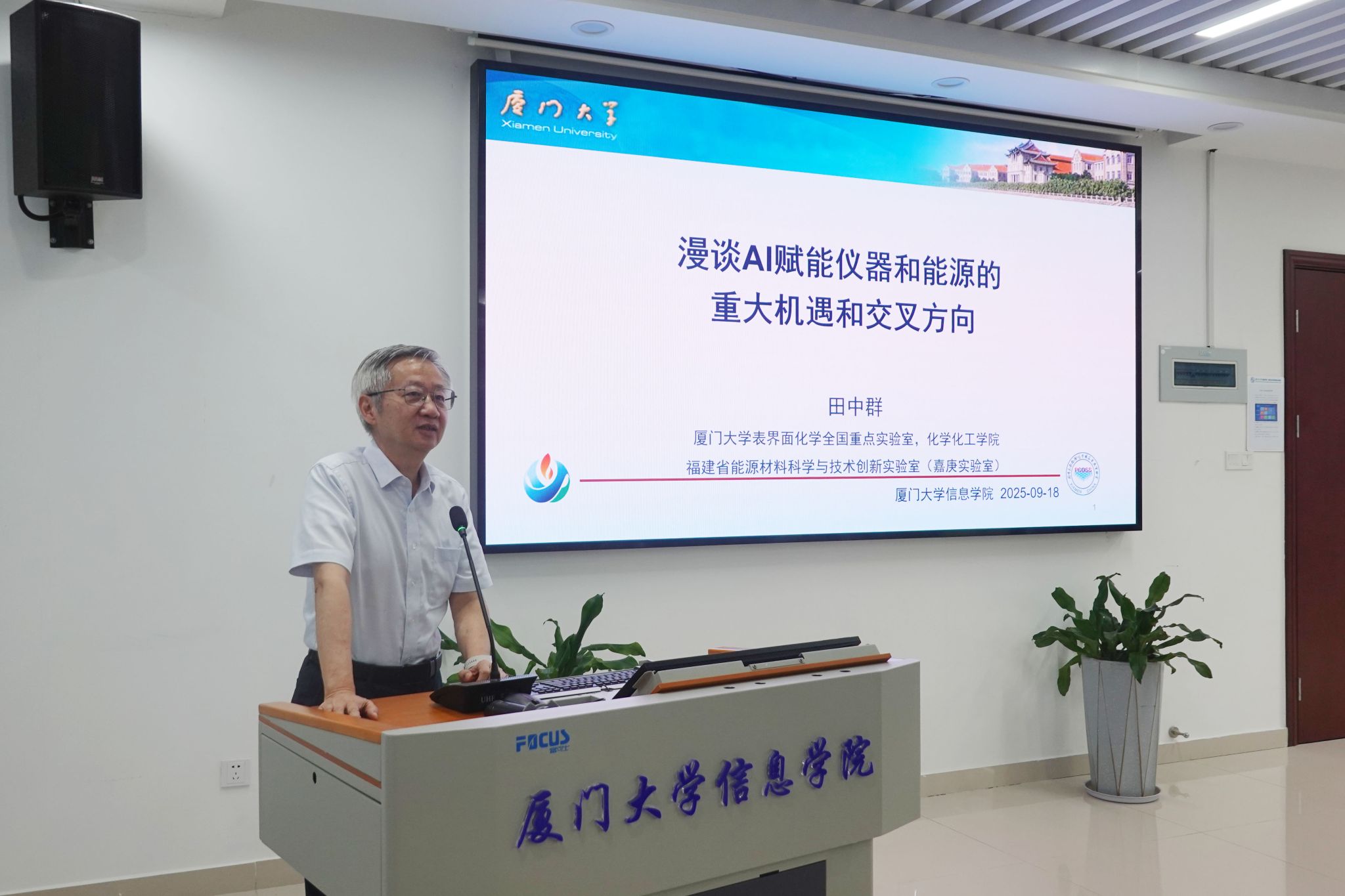 论坛上,刘弢代表学院作院情简介。沈志荣、杨和林代表科研团队作交流分享。随后,田中群作《漫谈AI赋能仪器和能源的重大机遇和交叉方向》专题报告,畅谈对人工智能赋能科学研究,促进学科交叉的体会与看法。