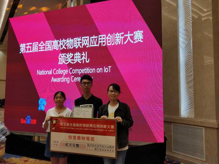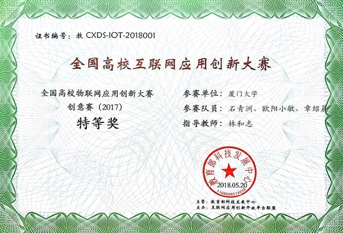 “全国高校物联网应用创新大赛”是教育部科技发展中心和互联网应用创新开放平台联盟主办的面向全国高校开展的物联网竞赛活动。2018年全国总决赛由清华大学、苏州职业技术大学承办,ACM中国理事会、百度公司、亚马逊AWS、新华三物联网、清华信息科学与技术国家实验室等单位协办。2018年“全国高校物联网应用创新大赛”创意组吸引了来自国内200余所高校的500多支代表队、600余名指导教师和2000余名学生报名参赛,选手来自浙江大学、武汉大学、北京邮电大学、重庆大学等知名院校,竞赛规模和质量再创新高。经过全国七个分赛区的网评预赛、分赛区现场决赛的逐级选拔,遴选出43支队伍进入全国总决赛,总决赛队伍入选率不足10%,最后决出全国特等奖一队、一等奖三队、二等奖六队,竞争激烈。总决赛的颁奖典礼作为2018 图灵中国大会的周边活动之一,邀请了Vinton G. Cerf,Leslie Valiant,Raj Reddy 等图灵奖获得者、教育部领导、国内著名物联网专家学者和大赛支持单位负责人为参赛师生颁奖。