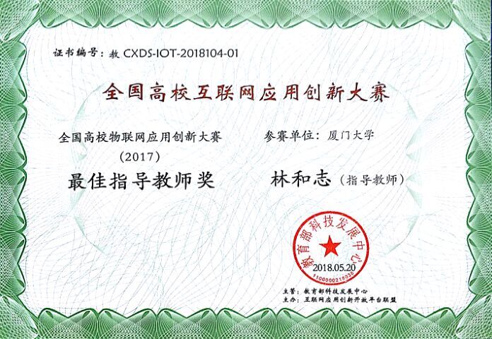 2018年全国总决赛,云集国内众多知名高校学子。我院“云满天厦”学生创新团队(成员:石青洲、欧阳小敏,章绍晨,指导老师:林和志)的参赛作品“基于UWB室内定位的无人机编队表演系统”以绝对优势成为本届大赛创意组唯一的特等奖作品。同时,创新团队指导老师林和志荣获“最佳指导教师奖”。在此之前,团队在中山大学举办的华南赛区比赛中荣获一等奖的好成绩,晋级全国总决赛。