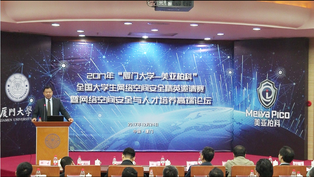 赖虹凯副书记做了精彩发言。他通过详实的数据、实例阐述了网络空间安全面临的严峻形势及其学科建设、人才培养的重要性。赖副书记指出厦门大学和美亚柏科的共建是一种有益的尝试,特别是此次邀请赛和论坛,搭建了网络空间安全学科交流的大平台,也希望越来越多的人加入,共同推动网络空间安全的发