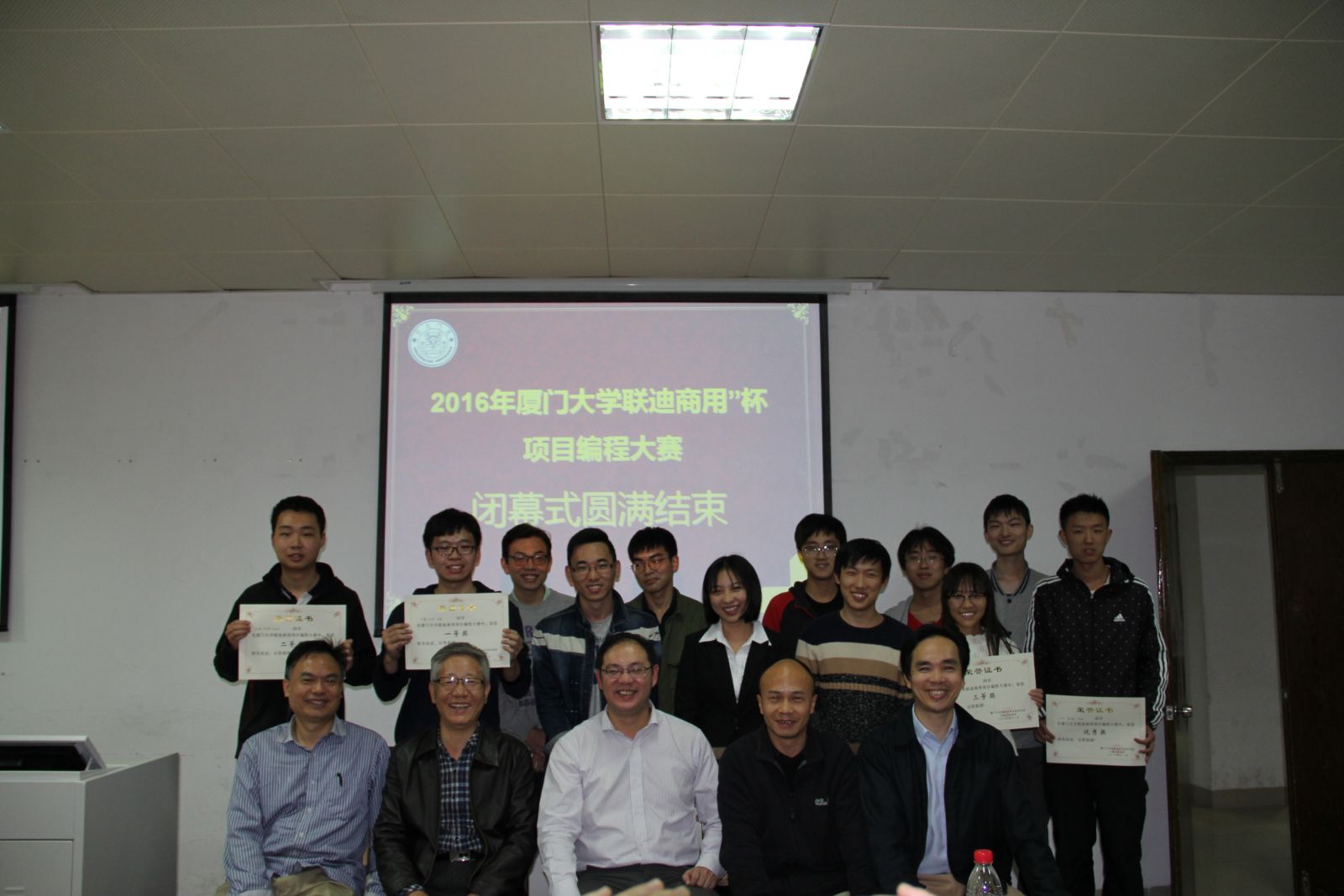 颁奖典礼上,在乐音和掌声中,雷蕴奇和潘悦华、我院专业教师们、联迪商用的优秀工程师们分别为获得一等奖、二等奖、三等奖和优秀奖队伍颁奖。获奖队伍代表在领奖后分享了参赛的感想,他们十分感谢导师的悉心指导和工作人员们的辛苦付出,并且纷纷表示学到了更多无人小车知识,编程能力也得到提升。在热烈的掌声中,2016年厦门大学“联迪商用杯”项目编程大赛落幕,为期一个多月的比赛画下了圆满的句号。