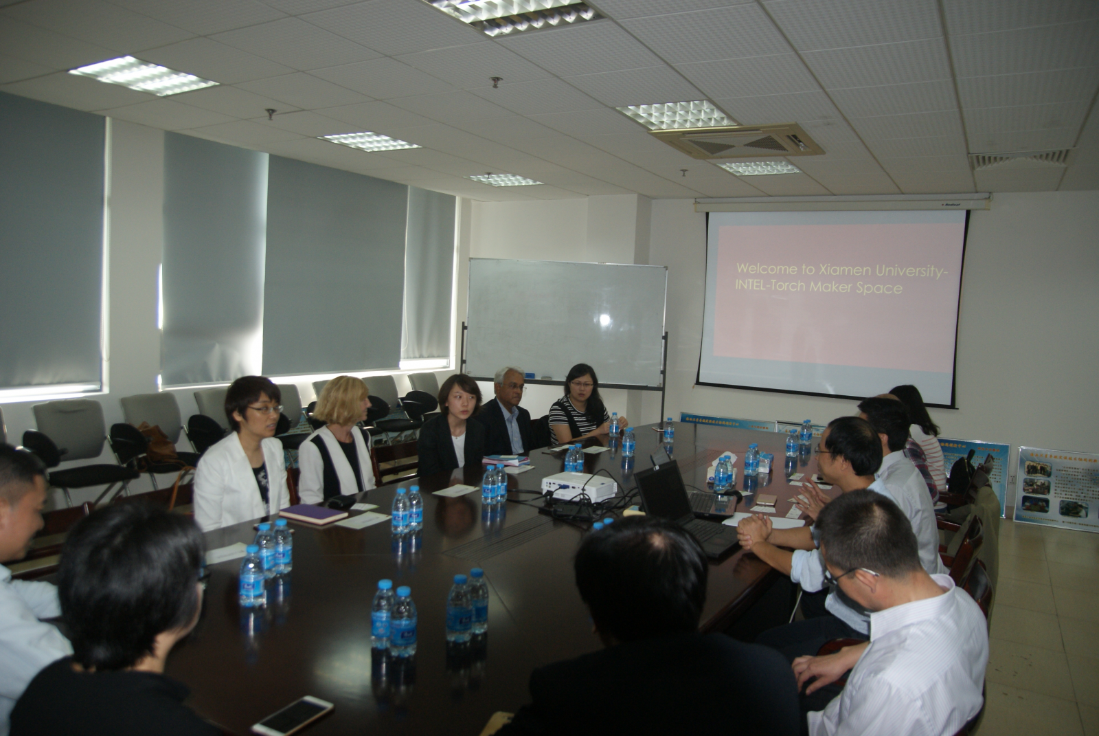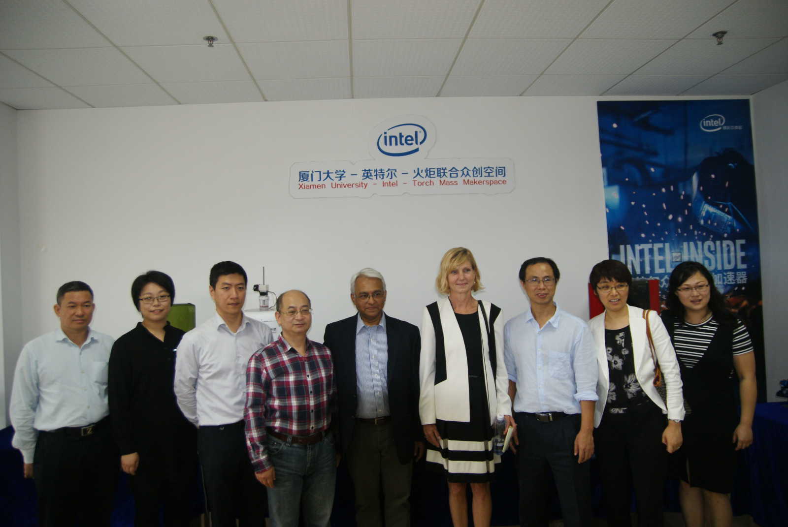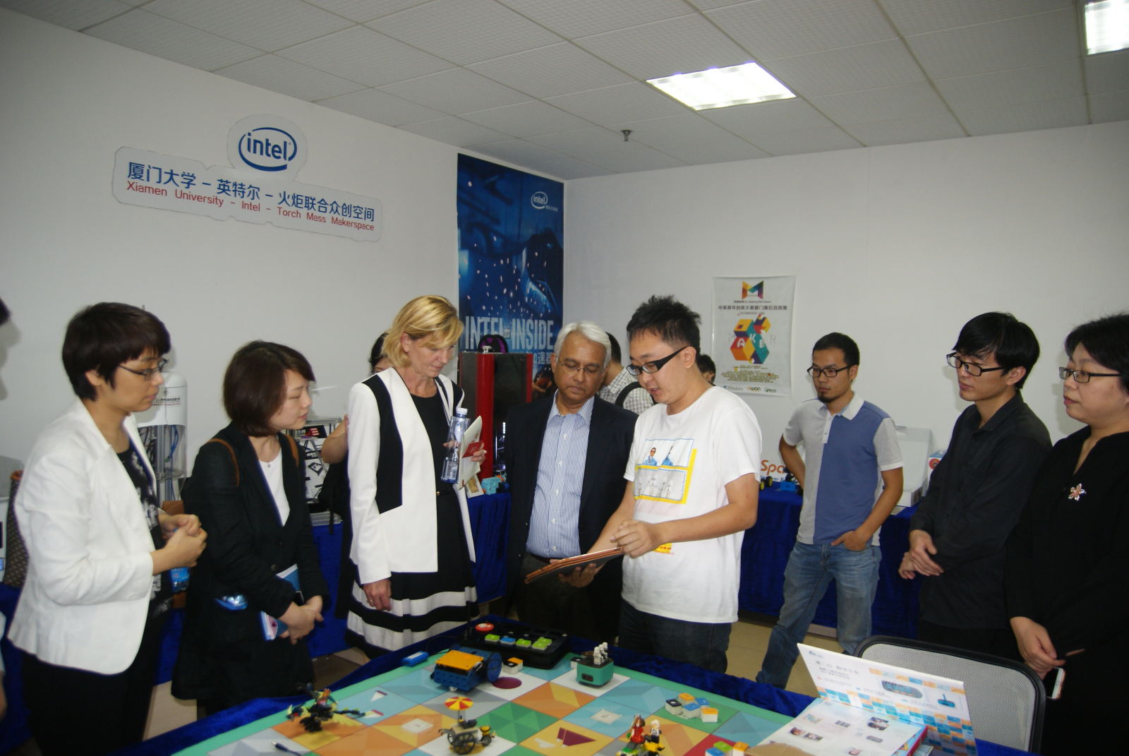 11月13日下午,英特尔全球大学合作项目总监Kaye Gardner-O’Kearny女士、英特尔亚太区企业事务总监Anjan Ghosh博士、中国企业事务部总经理朱文利女士、中国大学合作部经理颜历女士等一行来到厦门大学-英特尔-火炬创客中心(又名厦大-火炬极客空间)交流座谈,了解共建的众创空间运营服务情况,洽谈合作事宜。厦门火炬高新区软件园管理处处长倪杰先生、创新创业处处长洪奋新先生、厦门软件行业协会秘书长牟静女士、厦门大学现代教育技术与实践训练中心副主任姚斌教授、厦门大学信息科学与技术学院副院长董俊教授、厦门大学海西通信工程技术中心主任石江宏教授、厦门大学通信工程系副主任洪学敏教授、福州大学工艺美术学院工业设计系主任洪歆慧副教授、派美特众创空间创始人毛连华先生、厦门大学-英特尔-火炬创客中心负责人郑灵翔老师以及2016年中美青年创客大赛总赛一等奖获奖团队成员等出席了座谈会。