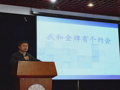 开幕式结束后,“我与金牌有个约会”活动随即展开。信息学院有幸邀请到了智能车大赛指导老师——信息学院副院长刘暾东,电子设计竞赛指导老师陈华宾,智能设计竞赛指导老师晁飞以及全国数学建模大赛特等奖得主李文然等人共同为大家带来了一场精彩横生的报告会。精密巧妙的电竞知识,团结友爱的团队精神,扣人心弦的建模简介,让现场不断爆发出热烈的掌声。