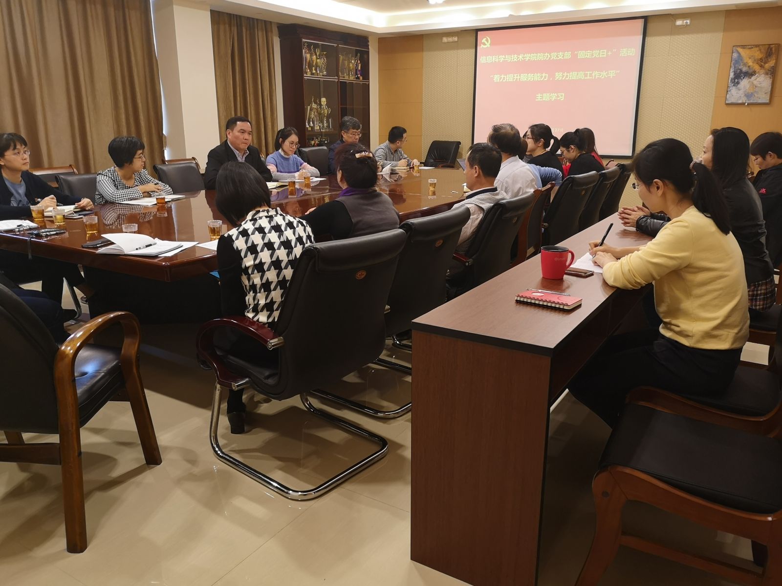 11月27日下午,我院院办党支部在学院C座610会议室举办“固定党日+”“着力提升服务能力,努力提高工作水平”主题学习活动。院办党支部全体党员,学院党政管理人员参加活动,公共事务学院院办党支部书记、教学秘书蔡妮妮同志应邀参加学习活动。活动由院办党支部副书记陈晨同志主持。