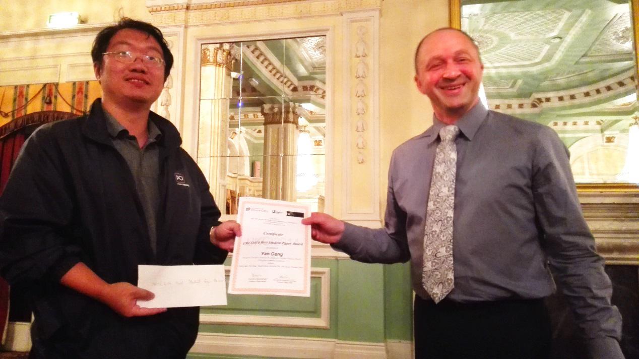 今年的UKCI会议收到了世界范围内包括英国众多名校在内的大量学术论文,最终有60篇论文获得录用。在获得录用的论文中,只有3篇被挑选为最佳论文奖的候选者,经过激烈的角逐,最终,姚刚同学的论文被选为最佳论文,并被推荐给计算智能领域著名期刊soft computing刊发 。