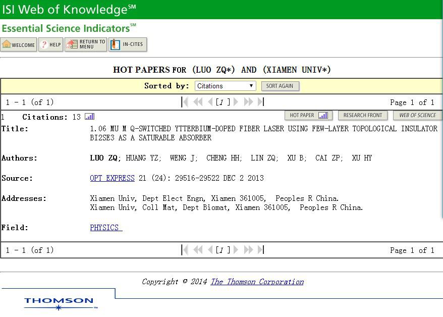 saturable absorber”, Optics Express, 21(24), 29516,Dec. 2013)。 该论文首次利用拓扑绝缘体Bi2Se3实现了工业加工领域所需1μm波段的调Q脉冲激光,自2013年12月发表于光电子领域国际著名期刊Optics Express以来,迅速受到国内外相关学者广泛关注,截至目前SCI显示被引用17次,Google scholar显示被引用35次。另外,此次以厦门大学为第一单位入选ESI“热点论文”仅两篇,另一篇来自厦门大学医学院许华曦和卜国军教授团队(Nature Reviews Neurology, 9(2), 106-108, 2013).