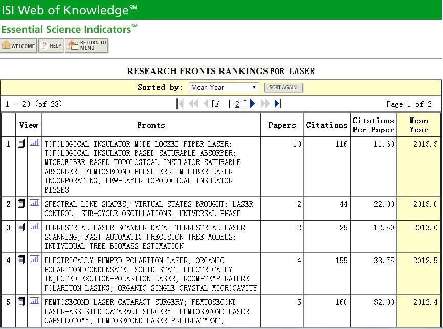 拓扑绝缘体是一种具有奇异量子特性的新物质状态,为近年来物理电子学等领域的重要研究主题之一,被认为有可能引发未来电子技术的新一轮革命。最近,拓扑绝缘体的光子特性研究(特别是其激光应用研究)引起了国内外科学家广泛兴趣,近2年已迅速成为激光研究领域的前沿热点之一,在ESI“研究前沿(Research Fronts)”中显示(如下图):拓扑绝缘体激光应用研究被列为该领域最新的研究热点 (排名第一)。厦门大学电子工程系以罗正钱副教授和蔡志平教授为代表的研究团队,是国内外开展二维光子材料(包括石墨烯、拓扑绝缘体等)激光应用研究的领先团队之一。 该团队自2010年在国际上首次报道石墨烯调Q激光器以来[Luo ZQ*, Cai ZP, et al, Optics Letters, 35(21), 3709, 2010. 被引123次(google scholar)], 在此领域发表SCI论文20余篇;2013年该团队开始瞄准国际最新前沿——拓扑绝缘体激光应用研究,获得了一系列代表性成果,除了上述ESI “热点论文”之外,围绕该方向最新发表2篇JCR1区研究论文[Luo ZQ*, Cai ZP, et al. IEEE Journal of Selected Topics in Quantum Electronics,
