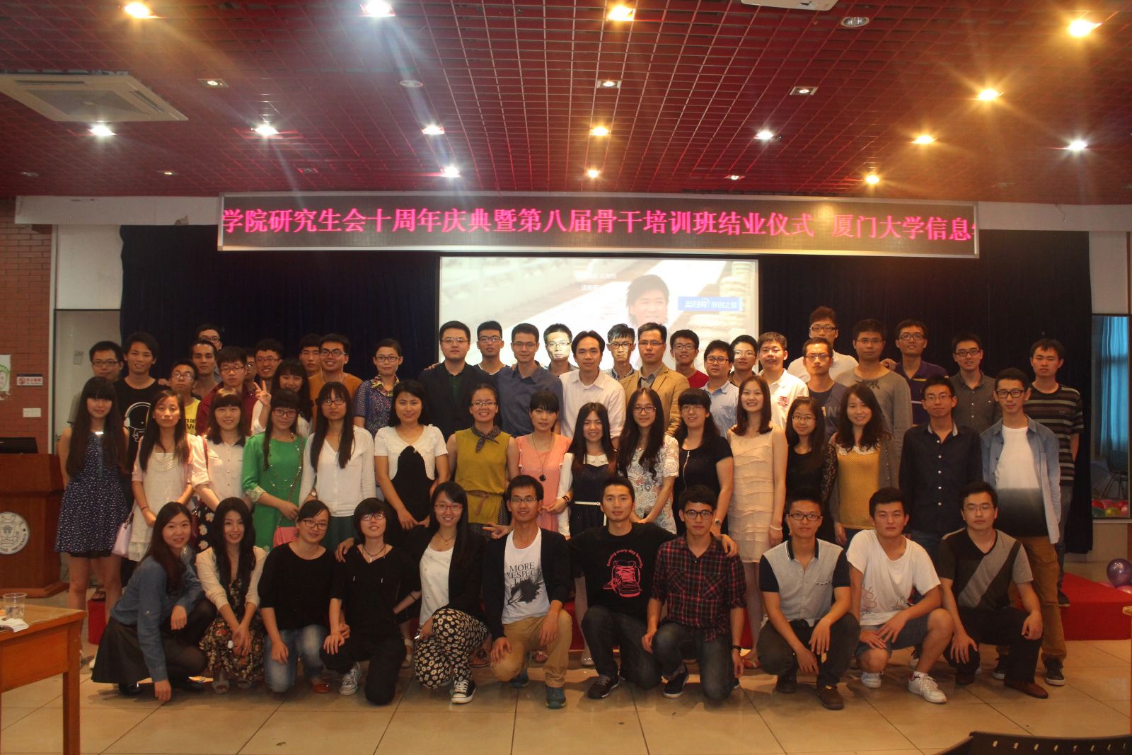 2014年5月11日下午厦门大学信息科学与技术学院研究生会迎来了自己的第十个生日,同时第八届骨干培训班也正式结业。学院党委副书记李承华老师,团委副书记韩海雄老师,辅导员倪建超老师、黄艺明老师,以及往届的主席和副主席们不顾绵绵细雨前来出席。阴霾的天气挡不住联欢会中肆意的欢笑,在短短的2个多小时中,各路才子佳人尽显风采,精彩不断。