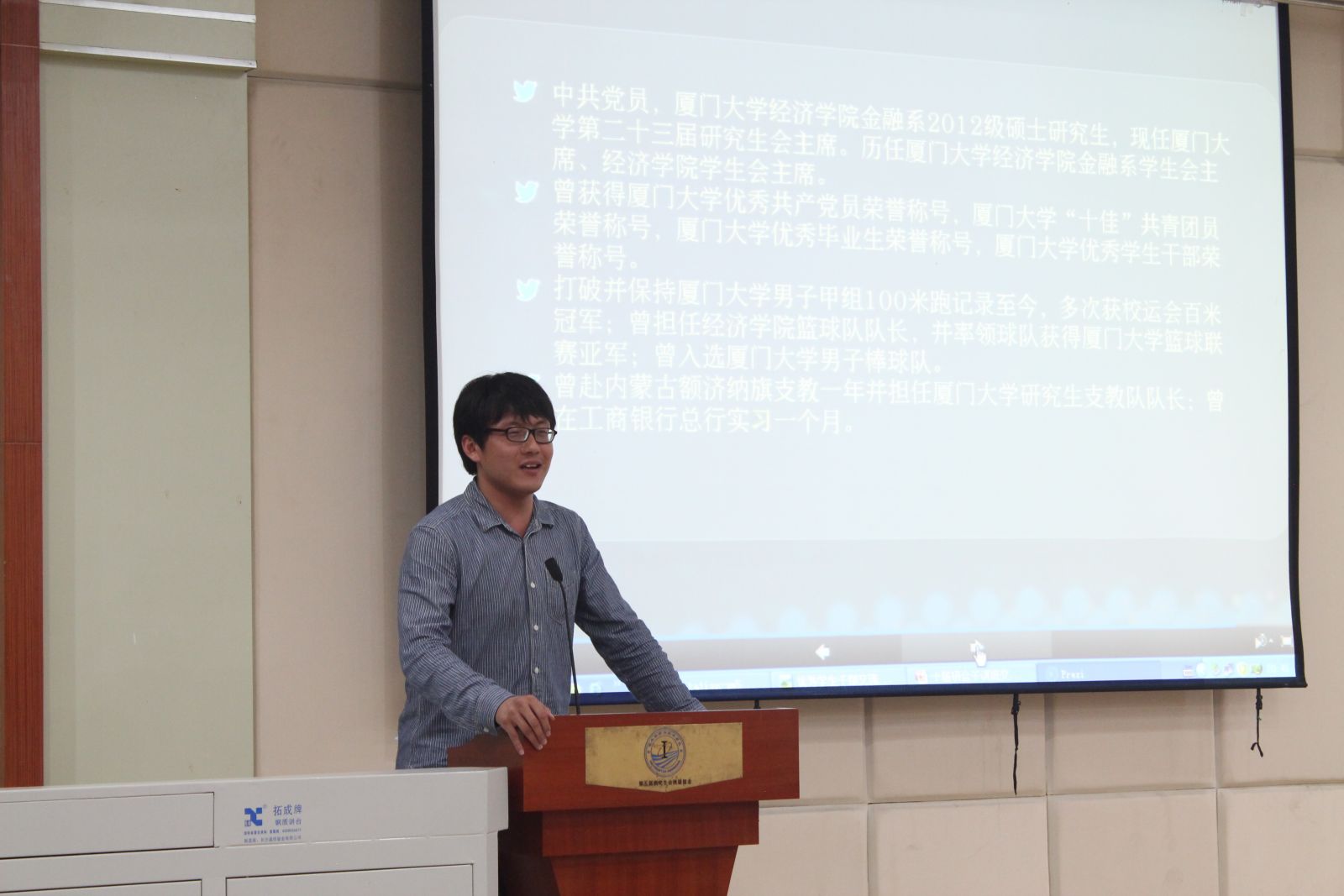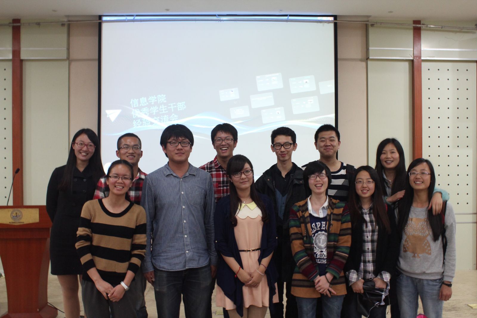 2014年4月8日晚上7点,信息学院研究生会骨干培训班优秀学生干部经验交流会在海韵教学楼504召开。本次交流会邀请了学校优秀学生干部郑玮、陈阳、黄文睿、杨盛澜作为嘉宾,与大家分享了自己如何成长为一名优秀的学生干部,如何真正做到不负当下最可宝贵的岁月。