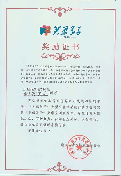 “芙蓉学子·榜样力量”优秀大学生评选活动是由中国青少年发展基金会、共青团湖南省委和湖南中烟工业有限责任公司联合主办的助学公益活动,我校自2012年起开设此项评选。2012年,我院智能车队在第七届厦门大学“芙蓉学子·榜样力量”优秀大学生评选活动中,荣获“芙蓉学子·团队合作奖”。