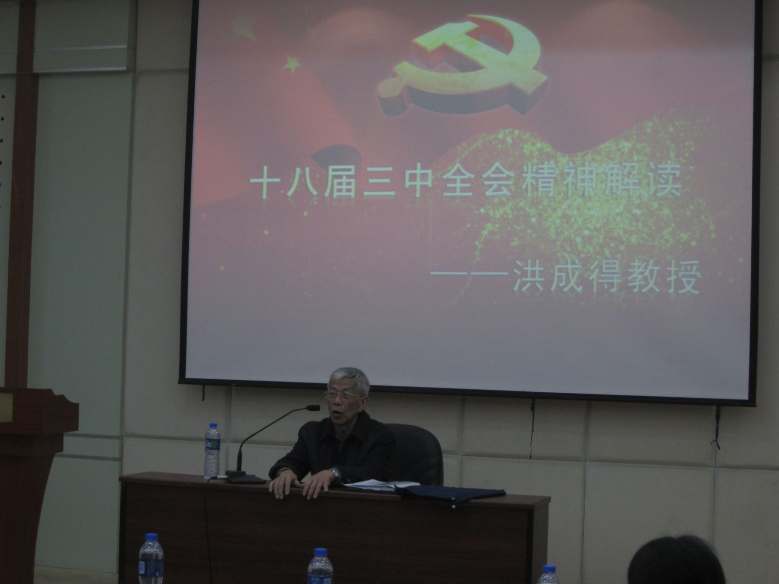 2013年12月15日早上9点,在海韵教学楼504报告厅,信息学院全体学生党支部书记、支部委员一起学习党的十八届三中全会精神,学院邀请到学校理论报告员洪成得老教授为学生党员干部作"十八届三中全会精神解读",学院党委副书记刘元庆老师、团委书记唐腾凤老师和辅导员黄艺明老师参加此次专题学习。