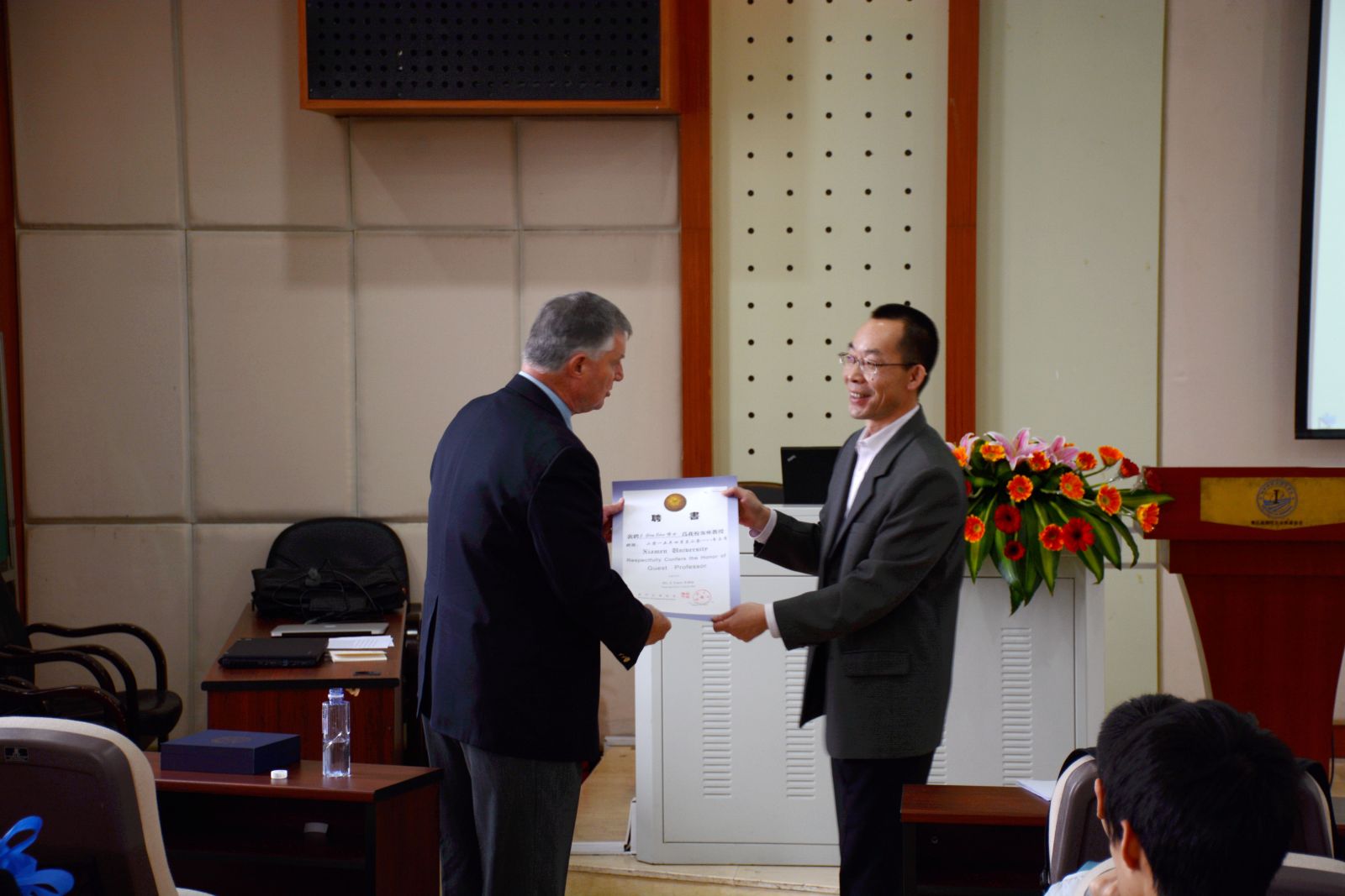 讲座开始前,举行了敦聘Eden教授为我校客座教授的仪式。作为邀请方,董俊教授介绍了Eden教授在光电子研究领域所取得的成就,并向Eden教授颁发了客座教授聘书和南强学术讲座纪念牌。曾在Eden教授课题组联合培养的博士生程辉辉同学作为学生代表献花。仪式结束后,Eden教授对受聘为厦门大学客座教授表示感谢,希望将来与厦门大学能够有进一步深入的合作。