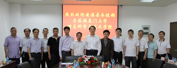 5月21日下午,由安溪县人民政府县长高向荣带队,县委常委、南翼新城管委会主任许锦青,安溪县人民政府科技副县长施金洋,安溪聚贤教育投资公司总裁胡振忠以及安溪县人民政府相关部门负责人一行17人到访厦门大学信息科学与技术学院,双方就合作建立“厦门大学(安溪)信息技术研究院”进行深入讨论并初步达成合作意向。信息科学与技术学院党委书记黄鸿德,副院长彭侠夫、刘暾东、董俊以及“厦门大学云计算与大数据研究中心”相关教授参加了会议。