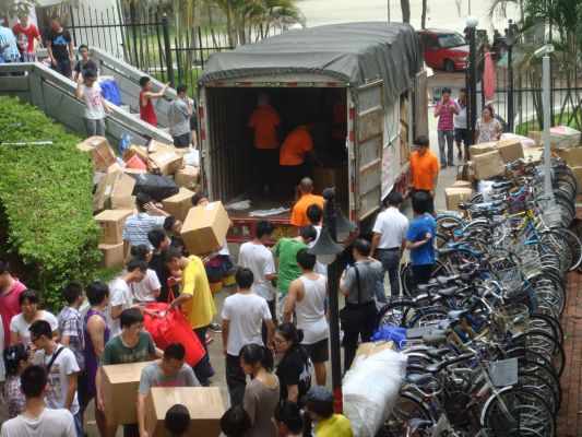 12日上午6点,信息学院搬迁大队从漳州校区整装出发,打响了搬迁工作的头炮。经过近2小时的颠簸,第一批搬迁大队于9点顺利抵达厦大学生公寓。为了使大家能够早日入住,短暂休息后,男生们立刻投入了行李搬运工作中。