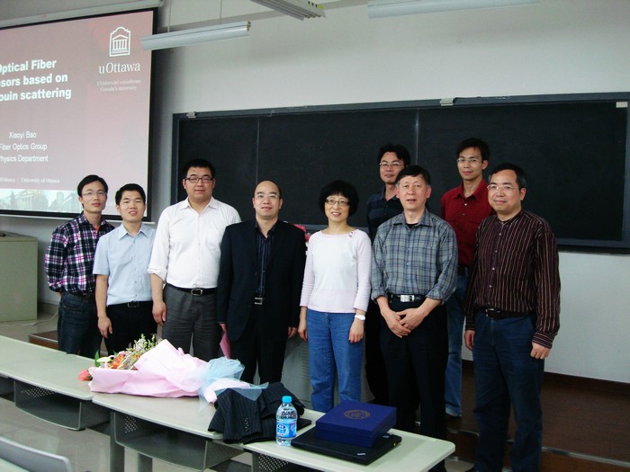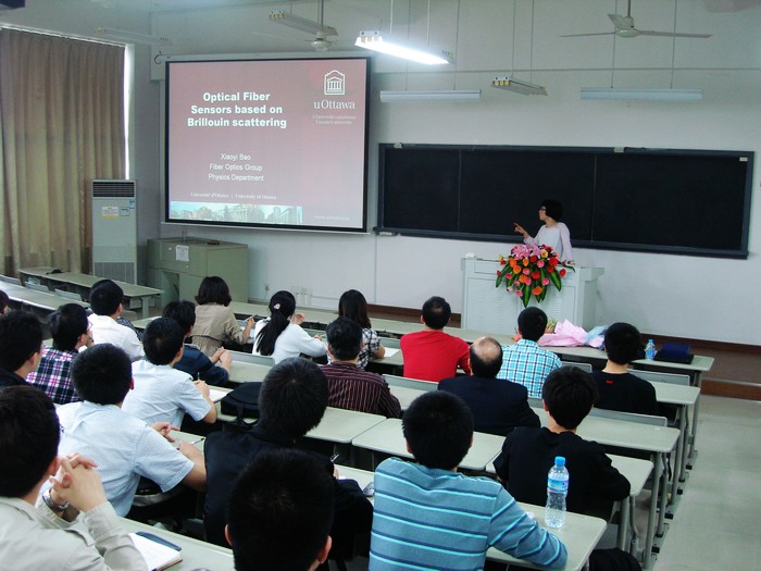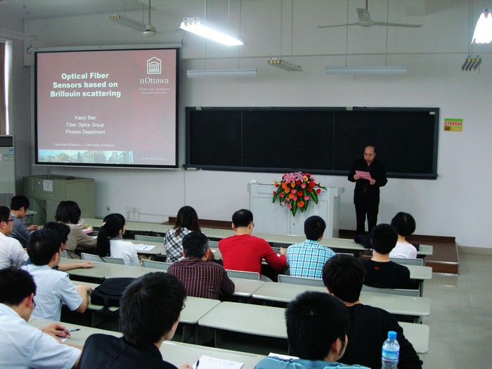 2012年4月28日(周六)下午 3:00,由信息学院主办的南强讲座第490期在海韵教学楼404举行。加拿大光纤通信领域首席科学家鲍晓毅教授为我们做了题为Optical Fiber Sensors based on Brillouin scattering(基于布里渊散射的光纤传感系统)的学术讲座。李茂青教授、董小鹏教授、熊兆贤教授(材料学院)等其他老师和50多位研究生参加了本次南强讲座。
