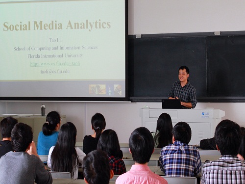 2012年5月4日下午,在海韵教学楼407,美国Florida International University (FIU)大学计算与信息科学学院终身教授,厦门大学信息科学与技术学院讲座教授李涛博士,为我院师生开展了一场主题为Social Media Analytics(社交媒体分析)的讲座。在讲座中,李涛博士为我们详细介绍了社交媒体的特性,所涵盖的研究领域,如数据挖掘,机器学习等,旁征博引,将复杂的科研分析模型与常见的社交媒体在各行各业的应用相结合,由浅入深的让大家了解到社交媒体日益凸显的重要性及对日常生活的影响,李涛博士还为我们展示了社交媒体领域的最新研究成果,并和同学们进行问答交流。讲座结束后,同学们纷纷表示受到社交媒体的前沿知识熏陶,受益匪浅。 (信息学院宣传中心 汪恒一)