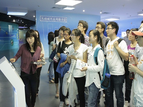 首先,无线城市体验厅的工作人员为同学们放了一段介绍“无线城市”的短片,让同学们对无线城市有一个感性的认识。接着,无线城市体验厅的负责人陈菲菲女士为同学们展示了厦门无线城市三年多建设与发展的成果,包括远程控制、信息交互、数据传输、视频监控等领先技术及其在办公、旅游、医药、交通、经贸等领域上的应用。在随后的产品体验环节,同学们试用了与传统的电视直播完全不同的TD-LTE即摄即传技术。仅通过一块砖头大小的设备,精彩纷呈的直播画面便在同学们眼前展现,给同学们留下了深深的印象。最后,同学们在公司门口合影留念,本次活动顺利结束。
