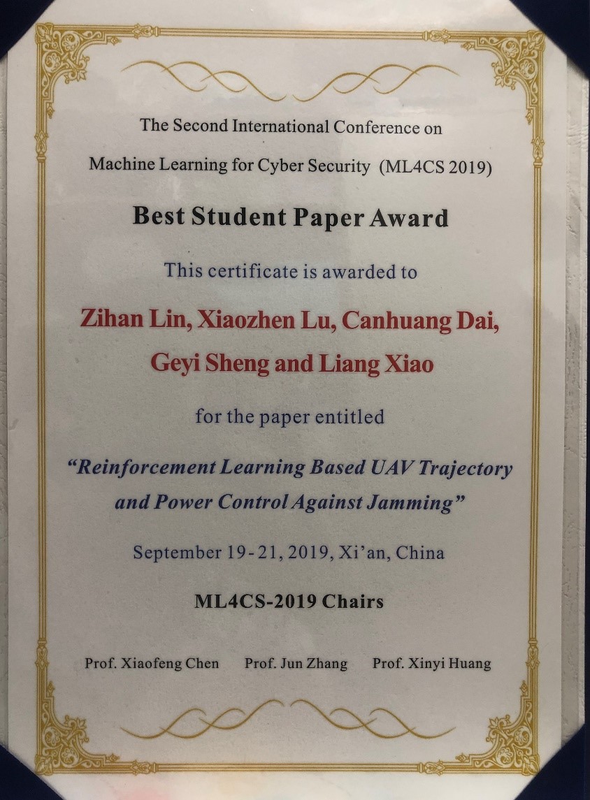 2019年9月19日,第二届网络安全机器学习国际会议(The Second International Conference on Machine Learning for Cyber Security,ML4CS)在西安召开。我院肖亮教授其指导研究生林紫涵、卢晓珍、戴灿煌和盛葛怡同学完成的论文“Reinforcement Learning Based UAV Trajectory and Power Control Against Jamming(基于强化学习的无人机抗干扰轨迹和功率控制)”被该会议录用并获得最佳学生论文奖。