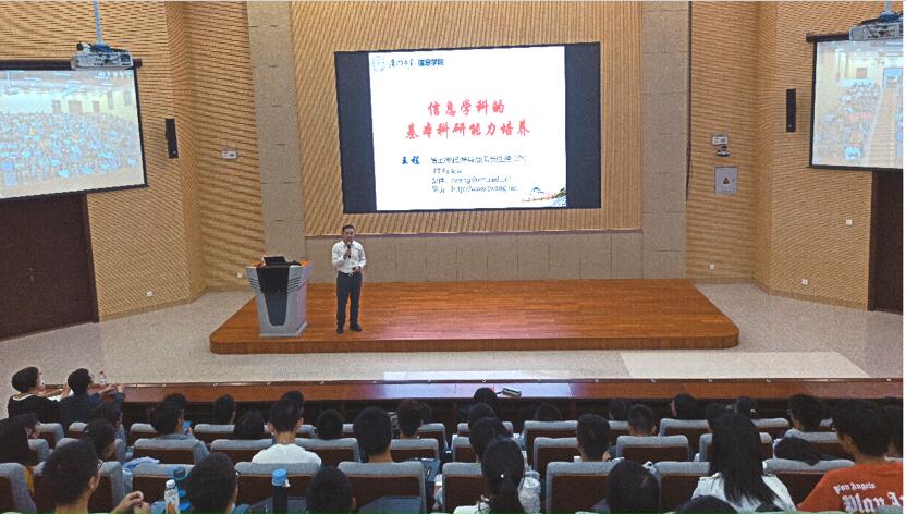 随后,王程教授以《信息学科的基本科研能力培养》为题,给同学们带来了本次系列活动的首场讲座。王教授从科研能力培养的主要环节展开介绍,对如何选择研究方向、参与科研项目,如何开展文献查新、科技写作、学术交流,怎样更好地激发创新等方面做了精彩讲解,分享了自身学习的经历,并展示了学院重点实验室的研究情况和研究成果。他希望,同学们能够提前了解科研,做好充足准备,建立良好的自我认同,在未来的求学路上找到适合自己的路。讲座之后,同学们就如何更好地阅读英文文献、如何度过迷茫的大学一年级等问题积极提问,王程教授结合实例从多角度进行答疑解惑,现场交流气氛活跃,反响热烈。新生们通过本次讲座,对科研有了更清晰的了解,也更加明确今后的学习目标和努力方向。