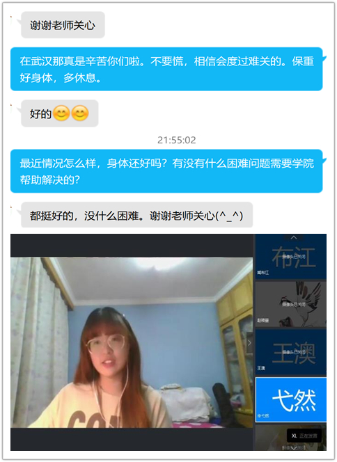 如何度过漫长而枯燥的宅家生活,让学生们安心健康?2018级计算机系2班班主任雷蕴奇老师亲自撰写了一封充满温情和关怀的信,发给班级全体同学,从心理、家庭、学习等多角度给予特殊时期中的同学关心和问候,指导学生们解开期的心结,缓解焦虑情绪。2019级计算机类5班班主任刘思聪老师建议学生们在家要形成良好起居习惯,按照正常上课节奏安排时间,要饮食健康,也要适度锻炼,做到服从纪律,严格防控,面对疫情要保持积极健康心态,隔离不隔心。主题班会结束后,刘老师还特别单独联络了班上几位家住湖北的学生,详细了解他们的生活情况,鼓励他们。