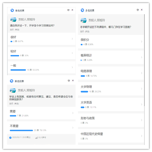 为了更好掌握学生线上学习存在的实际困难,确保一个都不能掉队,各班班主任通过多渠道搜集学生们遇到的问题。2017级计算机1班班主任罗雄彪老师从学习效率、学习氛围、学习教材等同学们切身关注的问题进行了逐一了解。2019级计算机大类3班班主任郑旭玲老师则从开设课程、线上学习效果以及支持渠道等学业相关的方面发起了三个关于学习的调查问卷,详细地调研班上学生的学业情况,并针对学业遇到问题的学生,进行了一对一的交流指导,为他们提供具体的学习建议。