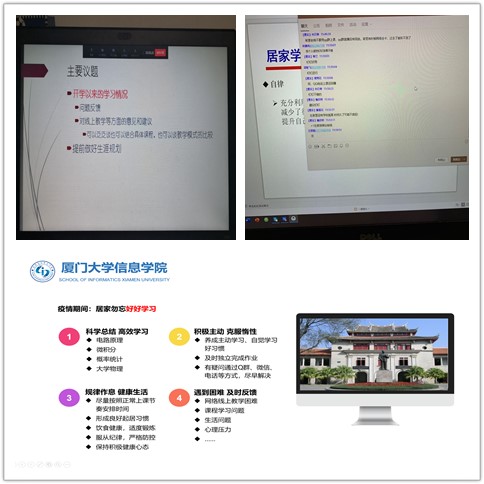 开学以来,信息学院全面贯彻落实停课不停学的要求,扎实做好线上教学工作。为了让学生更好地规划线上学习生活,保障学习效果,减少疫情对学生的影响,确保线上学风建设不掉线,信息学院本科生班主任在繁忙的线上教学工作之余,通过视频会议、QQ直播、问卷调查等方式,围绕线上学习,共克疫情新学期,新起点促学风,齐奋进我为抗疫做贡献等主题,开展了内容丰富、形式多样的线上主题班会,给学生们带去问候、嘱托,为同学们答疑解惑,提供有益的学习建议和帮助,也增强了大家早日战胜疫情的信心。