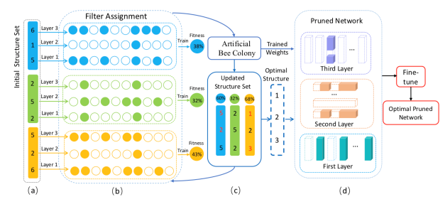 本文第一作者是人工智能系2018级硕博连读生林明宝,通讯作者是其导师纪荣嵘教授。本文提出了一种自动化网络结构搜索的模型剪枝算法,无需消耗人力成本既能实现神经网络的压缩与加速。研究发现,深度神经网络的剪枝效果与网络大小没有太大关系,而是取决于剪枝后的网络结构,即每一层保留的卷积核个数。因此,我们将剪枝过程分为两个阶段:最优剪枝网络结构搜索和搜索模型重训练。针对第一阶段,本文提出将结构搜索问题表述成数学优化模型,并结合人工蜂群算法,开展启发式的最优结构搜索。搜索结构表明,本文提出的结构搜索方案能够得到更低的压缩模型。针对第二阶段,我们使用训练数据对压缩后的模型进行重训练,在实验中我们发现,压缩后的模型随机继承未压缩模型的权重,既能迅速恢复精度表达能力。在CIFAR-10和ImageNet数据集上测试表明,本文提出的压缩与加速技术,在各种网络上,均能以更少的人力成本和训练时间成本,达到更高的压缩比和精度恢复能力。