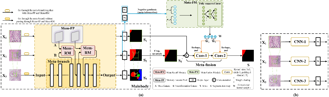 信息学院计算机科学系2018级硕士生吴桐、2019级硕士戴必成是该论文共同第一作者,信息学院曲延云教授、华师大谢源教授为该论文共同通讯作者。该论文提出了针对大分辨率、超大分辨率图像提出了一种有效的分割框架。框架使用一种基于多分辨率输入的结构,文章首先引入元学习的方式,设计了一种简单高效的融合结构,不需要复杂或者像传统方式那样堆叠多层卷积,就可以实现收敛快、精度高的融合效果。其次,文章设计了一种新颖的权重共享机制,只需要使用一个主干网络就可以实现多个尺度的分割,在降低网络总体参数量的同时还保证了高分割精度。