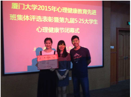 2015年5月27日下午,厦门大学第九届大学生心理健康节圆满落下帷幕。我院2013级计算机科学与技术1班在5月27日举行的的厦门大学心理健康教育先进班级的评选中获得了“心理健康教育先进班级”的称号。