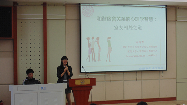 开幕式在同学们对本次宿舍文化节的期待中结束。我院荣幸邀请到厦大心理咨询与教育中心的陈梅香老师为到场的同学们带来了本次宿舍文化节首场讲座。陈梅香老师讲解生动有趣,援引生活中的例子为同学们排忧解难,犹如一堂洗濯心灵的心理健康课程,同学们听得津津有味,也在暗自反省。陈梅香老师强调了舍友关系的重要性,鼓励同学们多与舍友交流、交心,避免“不与舍友交谈”、“舍友的事与我无关”、“躲避舍友”等情况的出现。讲座时间持续约一小时,在讲座后的提问环节同学们积极举手发言,讲出自己心中的疑问和困惑。第一位提问的女生讲述了考研时与舍友之间产生的问题,陈梅香老师切合实际给女生具体解答。另一位男生想要改善宿舍关系,自己积极对待担效果不好,问是否还需要积极下去。该问题引起了两方面不同意见的争辩,现场气氛活跃。
