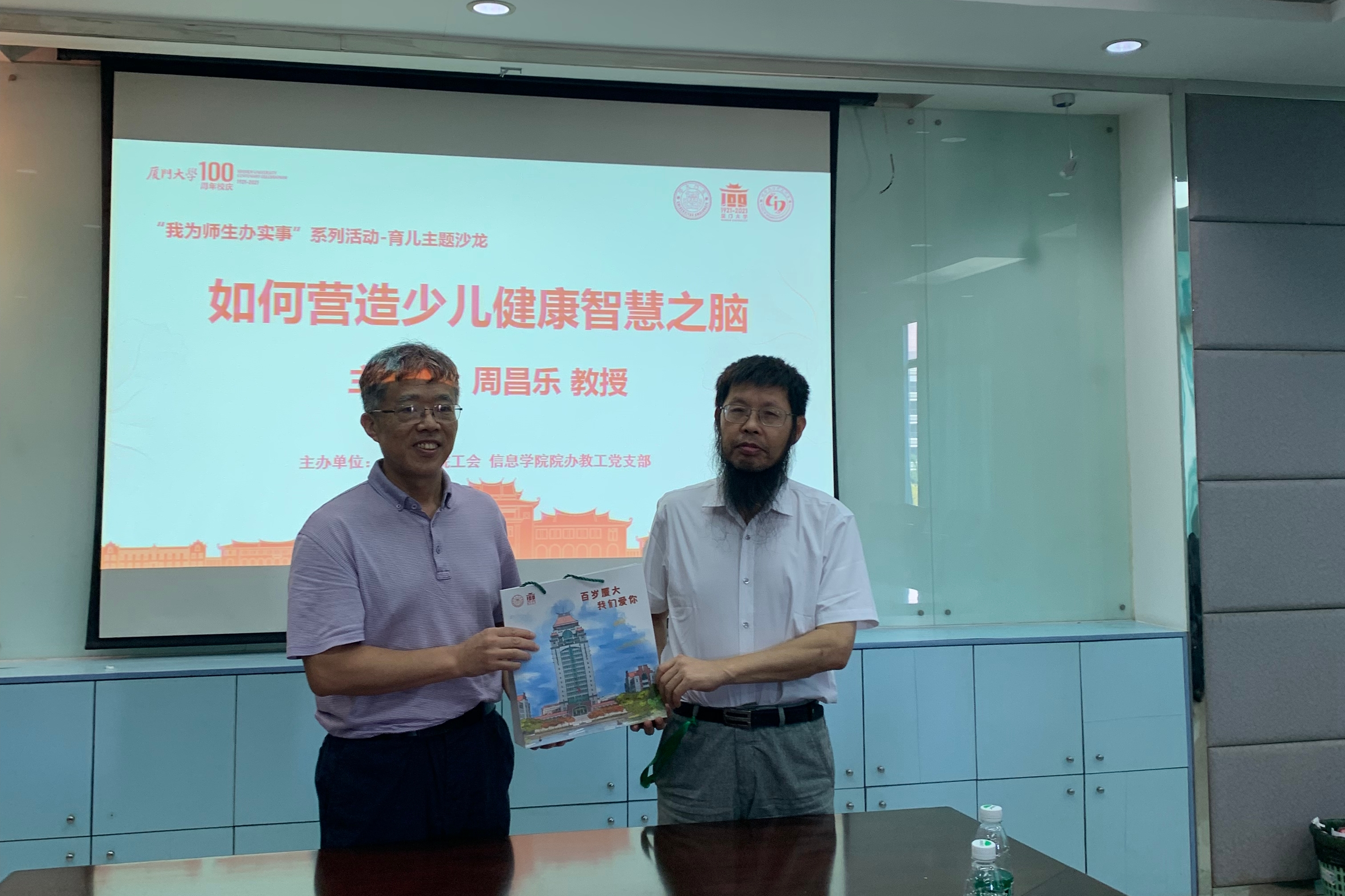 为落实“我为师生办实事”项目,缓解教职工的生活和工作压力,搭建教职工联系交流平台,学院工会和院办教工党支部联合举办育儿主题沙龙,于7月14日下午邀请学院老院长、人工智能系教授周昌乐老师为学院教职工开讲《如何塑造儿童健康智慧之脑》。活动由院办教工党支部书记林珏主持,学院工会主席杨蔷及部分教职工参加。