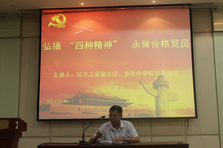 大会结束后,厦门大学校关工委副主任、原软件学院党委书记杨敬达同志向学院全体党员做了题为《弘扬“厦大四种精神”,永做合格党员》的专题讲座。这是软件学院“两学一做”学习教育安排的重要内容之一。杨敬达同志用详实的数据、丰富的事例为我们一一讲述了陈嘉庚先生的爱国精神、弘罗扬才烈士的革命精神、萨本栋校长内迁闽西艰苦办学的自强精神以及王亚南校长和陈景润校友的科学精神。其中有很多是平时鲜有人知道的数据和史实。杨敬达同志认为,厦门大学“四种精神”是厦门大学优良办学传统的历史积淀,是一笔高贵的精神财富,更是厦门大学持续发展、厦大人不断进步的不竭动力。他号召全体党员学习并弘扬厦门大学“四种精神”,在自己的学习和工作岗位上做出自己的贡献,即便以后毕业离校,仍要将厦大的“四种精神”根植心中并带到各地,使之遍地开花。