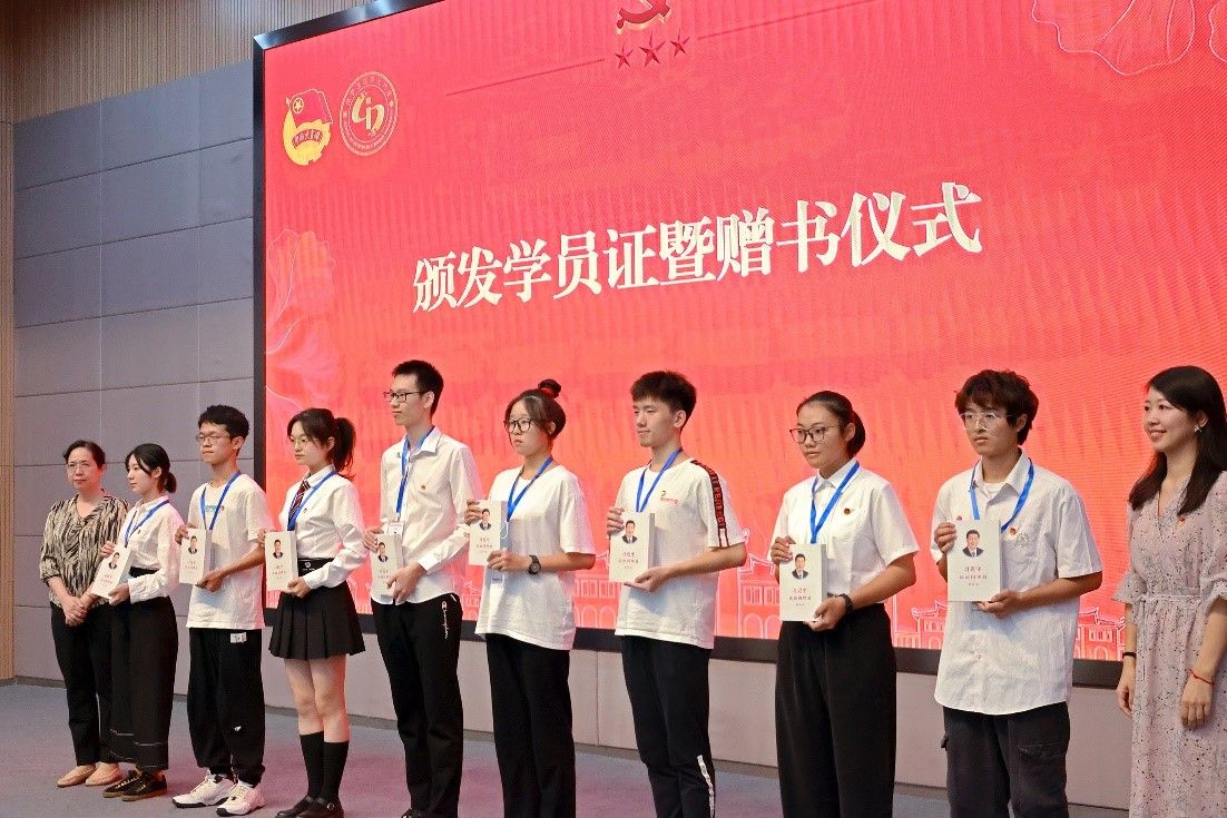信息学院党委副书记龙坚毅、法学院团委书记刘茜为新学员代表颁发学员证并赠书《习近平谈治国理政》。