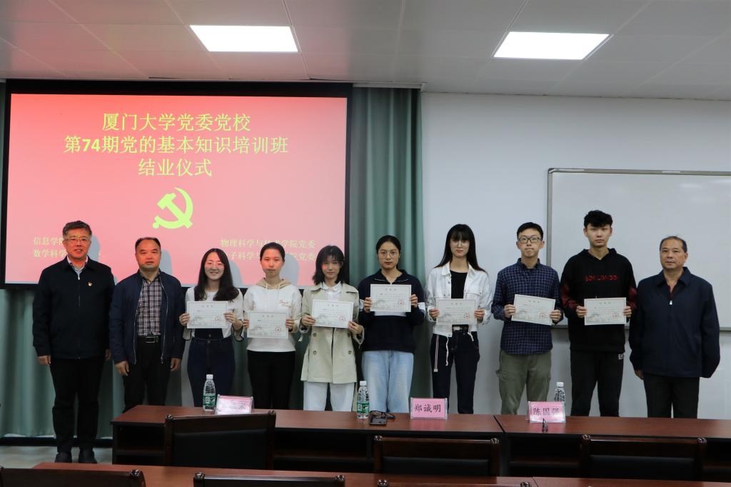 11月15日下午,厦门大学党委党校第74期(海韵园区)党的基本知识学习班结业仪式在海韵园行政楼A201隆重举行。信息学院党委副书记杨蔷、数学科学学院党委副书陈国强、物理科学与技术学院党委副书记郑诚明出席了结业仪式。结业式由信息学院党务秘书张随刚主持。