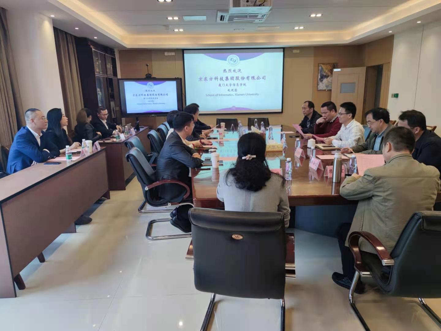 11月30日下午,信息学院“人工智能赋能企业”系列活动之走进领军企业京东方科技集团股份有限公司在厦门大学海韵校区行政楼C610会议室成功举办。京东方一行九人到访我院。我院党委书记刘弢、副院长姚俊峰教授、各系主任或副主任及其他教师代表参与了此次座谈。
