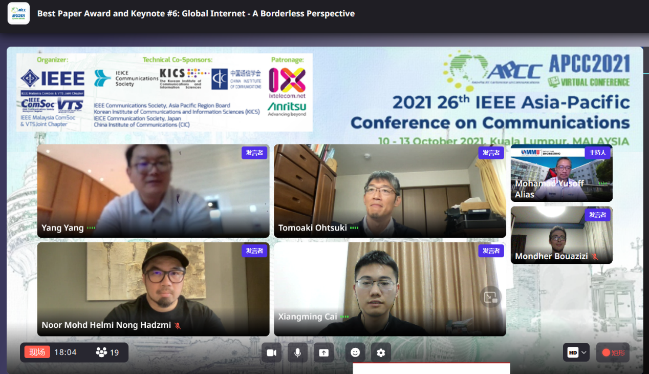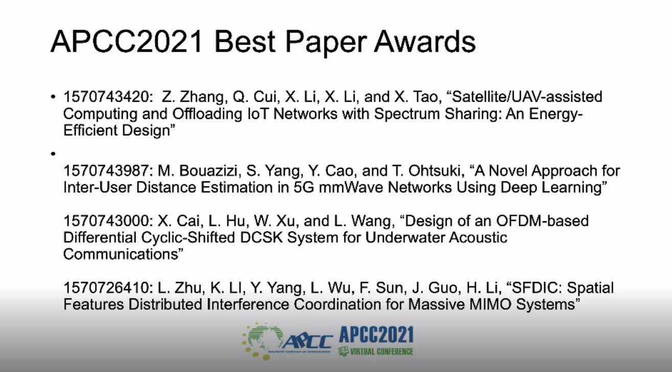 据悉,亚太通信会议Asia-Pacific Conference of Communication (APCC)创办于1993年,是由中国通信学会、韩国信息通信协会(KICS)、日本电子信息通信工程师协会所属通信协会(IEICE-CS)、IEEE Com Soc共同主办的国际学术会议。该国际会议已连续召开26届,旨在更好地发展亚太地区的通信技术,加强国际交流与合作。本届亚太通信会议于2021年10月10日至13日在马来西亚吉隆坡举行(线上会议),会议涵盖的研究领域包括移动和无线通信及网络、新兴技术、应用和服务等。